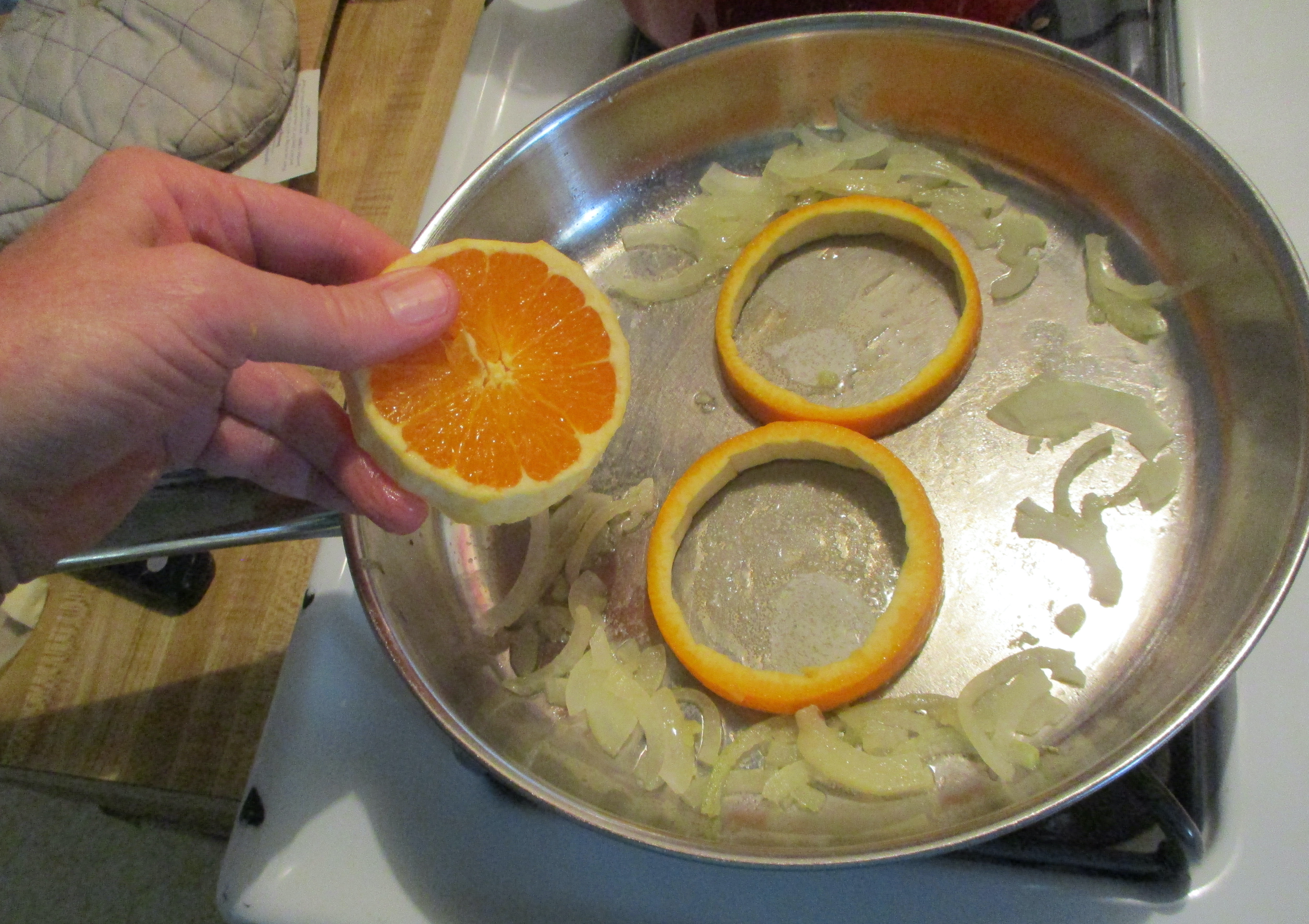 | 2. | Put butter and onions and orange circles into frying pan on low. |